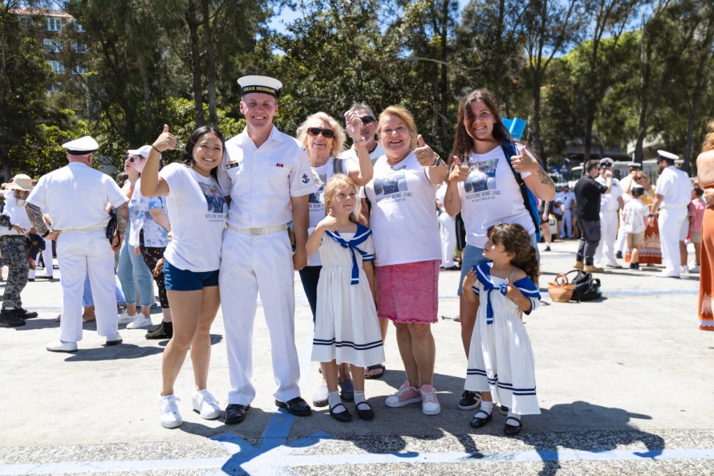 Image: A member of HMAS Brisbane’s ship’s company with family and friends after the ship returned to its home port following a successful deployment.